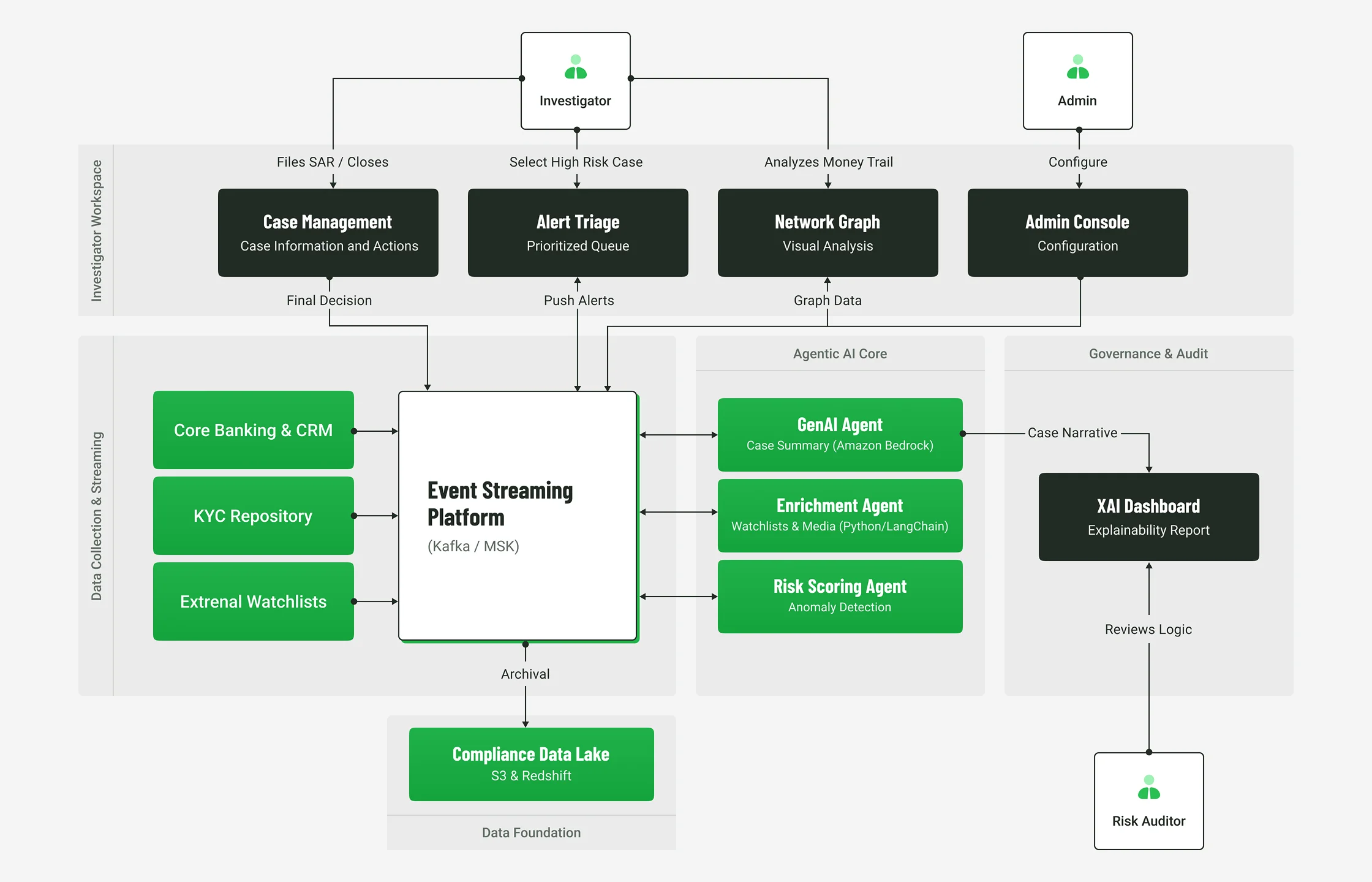 The agentic AI compliance platform was architected as a sophisticated network of specialized, autonomous AI agents, with each agent tasked to perform a specific function within the complex AML lifecycle. This agentic AI approach allowed for a far more dynamic, comprehensive, and nuanced analysis of risk than any traditional monolithic model could achieve. The core functionalities delivered to the client through this state-of-the-art platform included: